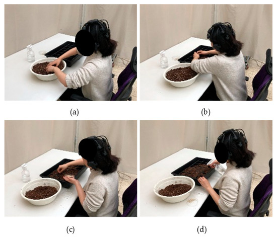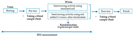 Before the start of the experiment, after explaining the experimental procedure to the participants, height, weight, and body mass index were measured. Afterward, the participant sat in the experimental space and wore a wireless electroencephalograph (Quick-20, Cognionics, Inc., San Diego, CA, USA). The seed sowing activity comprised of four stages (soil mixing, soil filling, seed sowing, and watering). Before starting the activity, the participant was asked to face the front and rest for 5 min. Next, the soil in the basin was mixed and transferred to a sowing tray. After that, the petri dish containing the seeds was opened, and the seeds were sown individually in the tray and finally watered with a sprayer. Each step was performed for 5 min, and the activity was performed for 20 min. Blood samples (5 mL) were collected from each participant before and after the activity. The experiment was conducted through a blind experiment and a randomized crossover study method, and the total experiment time was up to 40 min (Figure 3).