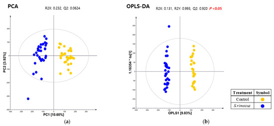 (a) The principal component analysis (PCA) and (b) orthogonal partial least square-discriminant analysis (OPLS-DA) score plot derived from GC-TOF-MS datasets for serum samples. Symbols, control (soil treated with media, ●) and treatment (S. rimosus, ●).