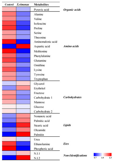 The metabolite analysis was performed based on the OPLS-DA model showing significant differences. A total of 33 metabolites (one organic acid, 15 amino acids, seven carbohydrates, five lipids, three others, and two unknowns) were detected. The detected metabolites were displayed on a heat map for visualization (Figure 6), and amino acids (except aspartic acid), lipids, and C6 sugar monomers showed significantly lower content in S. rimosus soil than in the control soil (p < 0.05).