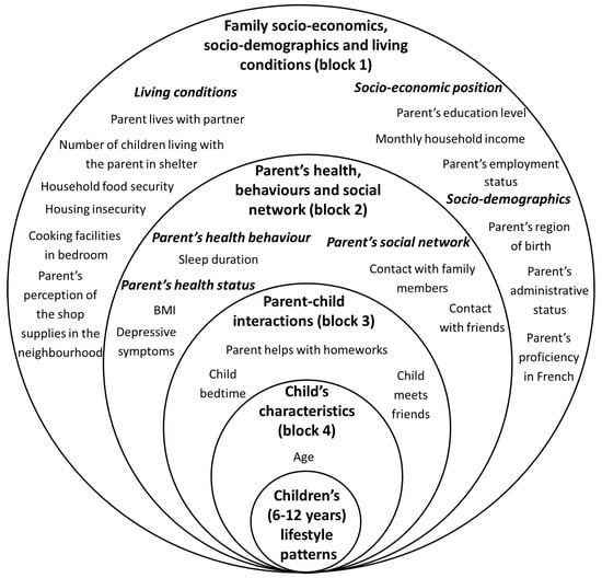 We adapted conceptual frameworks developed both in homeless settings and general populations to serve as an overarching guide for understanding how family socio-ecological factors can affect children’s lifestyle patterns [,]. The resulting model, presented in Figure 1, is divided into four levels: (1) socio-economic, sociodemographic, and living conditions; (2) parents’ health, behaviours, and social networks; (3) parent–child interactions; and (4) children’s characteristics. Supplementary Material S1 provides further details.