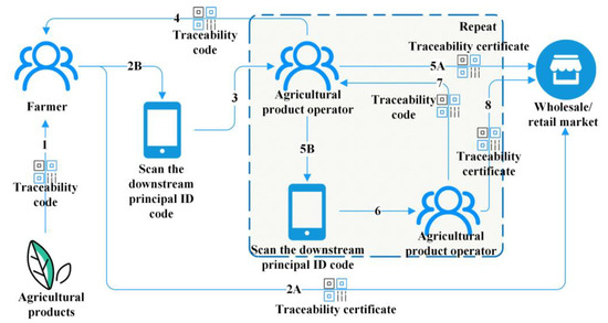 The national traceability platform was developed and constructed by the Agricultural Product Quality Safety Center of the Ministry of Agriculture and Rural Affairs of PRC, including traceability, supervision, detecting, and enforcement systems. The traceability system is the main component of the NTP, which is used to support agricultural product producers and operators to collect production and circulation information. Figure 1 shows the flowchart of the traceability system. First, farmers put agricultural product information into the system. Second, agricultural products can be sold in circulation and market. Among them, 2A: The agricultural products are directly sold in the market, and the traceability certificate is generated by the system; 2B: Farmers scan the identity codes of downstream transaction subjects to determine their identity information. Third, by scanning the identity code of the downstream transaction subject, farmers fill in relevant transaction information to complete the circulation sales of agricultural products. Fourth, the downstream transaction subjects confirm the completion of the transaction, and the system generates the product traceability code. Fifth, after the downstream subjects confirm the information of the purchased agricultural products and complete the filing, the agricultural products can be selected for circulation sales and market sales. Among them, 5A: Agricultural products are directly sold in the market, and the traceability certificate is generated by the system; 5B: Select the circulation link and repeat the 2B-4 process (This link can be repeated in a loop).