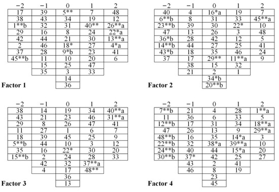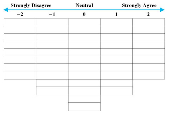 It is noteworthy that the factor extraction process depends on the eigenvalues and the factor loadings. In other words, not only should the extracted factors have eigenvalues greater than one but also they should include at least two significant viewpoints. There are three types of viewpoints: insignificant, significant and confused. Insignificant viewpoints are those insignificantly correlated with the selected factors. Significant viewpoints are those significantly correlated with one selected factor. Confused viewpoints are those significantly correlated with at least two selected factors. Insignificant and confused viewpoints are excluded from the analysis [44]. Moreover, taking into account each factor, the viewpoints with a loading factor greater than 2.58 × SE (Standard Error) are significant at the 0.01 level. SE is calculated as follows: , where N indicates the number of statements.