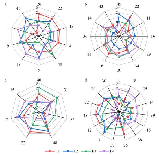 Figure 5 shows the Q-sort of the four factors. Tea farmers within each factor had similar perceptions of the NTP. We use factor 1 as an example to explain how to read the Q-sort. Among them, statements 48, 12, 26, 22, 13, 4, 41, and 6 in factor 1 represent “strongly agree.” Statements 26 and 13 are significantly different from the other factors at the 1% level, and statements 22 and 4 are significant at the 5% level. Appendix A Table A3 lists the full Q-sort for each factor.