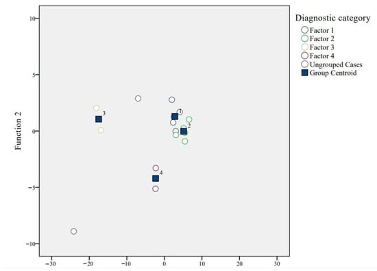Figure 7 plots the grouping of Functions 1 and 2, using their discriminant coefficients as coordinates for all tea farmers. It is easy to see that the classification results show smaller within-group distances and larger inter-group distances. Therefore, it can be stated that the results obtained by the Q-factor analysis are robust. That is, the Q-factor analysis can effectively predict and classify the perception of small-scale tea farmers for the NTP.