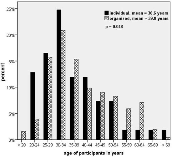 Individual trekkers (mean: 36.6 years) were slightly younger than the organized trekkers (mean: 39.8 years; p = 0.048, Figure 1). A total of 44.2% had no trekking experience, 21.4% provided up to 5 years of trekking history, and 39% had never been above 3000 m before (no significant difference between ind. and org.). Individual trekkers were more likely to travel in small groups without a leader (n = 100; 83.0% ≤ 5 team members; mean: 3.7 people; 70.3% no leader), in contrast to commercial trekking groups which consist of up to 19 clients (n = 203; 36.5% ≤ 5 clients and 32.5% 11–15 clients; mean: 7.9 people; p < 0.0001) with 2–5 tour guides per group (62.6%; n = 203; mean: 2.3 guides; p < 0.0001).
