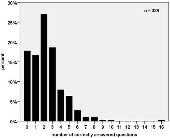 On average, the participants scored 61.2 out of 105 points for the FA questions. A total of 17.8% were not able to answer any question completely correctly, meaning that all five multiple choice answers were marked as incorrect. The majority (80.1%) completed up to 3 out of 21 questions correctly. The highest scored questionnaire had 16 questions answered correctly (Figure 2).