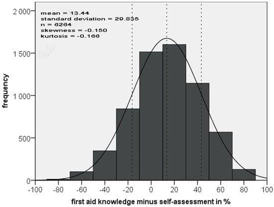 To measure the accuracy of the self-assessment compared to the actual knowledge proven by the questionnaire, both results were converted into a percentage and subtracted. This created a range from −100% to +100%, with 0% indicating a perfect match between self-assessment and FA knowledge of the respective topic. For example, −100% indicated an extreme overestimation or a complete lack of knowledge, and +100% signified an extreme underestimation of their FA skills.