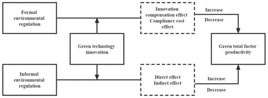 The R&D- and innovation-capabilities of companies appear to be essential in the impact of environmental regulation on green total-factor productivity. On the one hand, the improvement of green total-factor productivity requires advanced environmental-protection technology and production facilities, while the level of green innovation represents the innovation ability of enterprises. The higher the level of green innovation, the more scientific-research achievements in environmental management, and the greater the technical-support role for green total-factor productivity [51]. Against the background of tightening environmental-regulation policies, the green production-efficiency of enterprises will be constrained by the level of technological innovation. When the level of green technological-innovation of enterprises is improved, enterprises have sufficient conditions to reduce pollution and emissions, and in the process of environmental-regulation policy tools to control pollution emissions, they can obtain a first-mover advantage and differentiation advantage, reduce the pressure of environmental management, and effectively solve the problem of insufficient resources and the high cost of enterprises. On the other hand, enterprises with a high level of green-technology innovation will also create a positive image for enterprises, and send positive signals to the public, as well as to cooperative investors. This is so that enterprises can obtain more resources and revenue, have enough funds to carry out emission-reduction activities under the supervision of informal-environmental-regulatory forces, improve their resource utilization, and achieve optimal allocation. However, it is necessary to note that the level of green innovation requires continuous and high investments in the innovation process, which may increase the financial risk of enterprises and cause the breakage of their financial chains. Green-technology innovation will act as a moderating variable to influence the effect of environmental regulation on green total-factor productivity.
