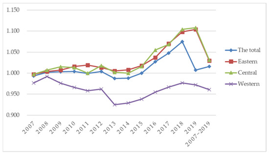 In this paper, we divide cities into eastern, central, and western regions for comparison, and analyze the changes of GTFP in the regions where cities are located, as shown in Figure 2. Figure 2 shows that “strong in the east and weak in the west” is the main characteristic of GTFP changes in the three regions. The range of GTFP fluctuates between 0.9 and 1.15, with a relatively small variation, but there is a regional-crossover variation between different years. Up to 2019, the central region is higher than the eastern region, and both are above the total level, while the western region is below the total-level line. The change of GTFP in the eastern and central regions is roughly in line with the total level, while the change of GTFP in the western region has a lag, slightly slower than the eastern and central regions.