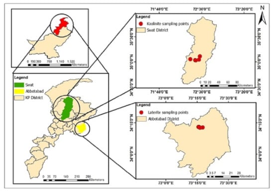 Laterite and kaolinite samples were collected from known deposits located in Khyber Pakhtunkhwa (Figure 1). Kaolinite samples were collected from the low hilly parts of Taghma, Tarkano, and the Matta area of Swat, Khyber Pakhtunkhwa. These Kaolin deposits at Swat occur within Kohistan ortho-amphibolites of Cretaceous age. The ortho-amphibolites contain felsic zones and leucocratic dikes that constitute the host rocks of Kaolin. They are part of the Cretaceous Kohistan island arc terrane []. The laterite samples were collected from the Kakul Tatta Pani area of Abbottabad district, Khyber Pakhtunkhwa. Laterite deposits in the Abbottabad region are hosted in the Abbottabad Formation of the Cambrian age [,]. A total of five different sites were sampled, namely, Tarkano-1, Tarkano-2, Taghma-1, Taghma-2 and Matta, for kaolinite, and HB-6, HB-7, HB-9, HB-10 and HB-12 for laterite. The freshly exposed surface was sampled manually by removing surface debris from the exposed deposits of kaolinite and laterite and stored in zip-lock plastic bags with proper labels. All samples were shifted to the geochemistry laboratory of NCE in Geology and were dried at room temperature. The samples were ground to pass through a 200 µm mesh size before further morphological and experimental analysis.