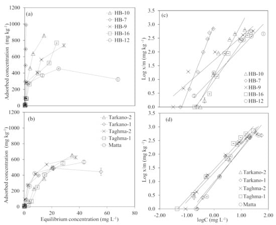 Adsorption isotherms of (a) laterite and (b) kaolinite, (c,d) depicts the Freundlich Equation (4) fit for As in the laterite and kaolinite, respectively. The trend line equation was solved to get adsorption parameters. Error bars indicate the standard deviation among replicates (n = 3).