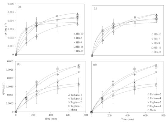 The pseudo-first-order equilibrium model fits for (a) laterite and (b) kaolinite and pseudo-second-order equilibrium model fits for (c) laterite and (d) kaolinite.