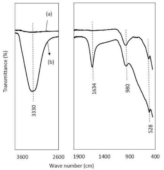 FTIR spectra of raw laterite and kaolinite before and after adsorption are depicted in Figure 4 and Figure 5. For laterite, in Figure 4, it was observed that there is a broad stretch at 3200 to 3400 cm−1 with a peak at 3330 cm−1, confirming the presence of the hydroxyl group (bonded-OH stretch) in the post adsorption sample, as the range between 3370–3405 cm−1 is designated for OH stretch []. The broad bands around 3330 and 1634 cm−1 in post-adsorption samples were assigned to adsorbed water, as a range of around 3365 and 1635 cm−1 for adsorbed water was also reported by Mbaye et al. []. Separately, a range of 1620–1640 cm−1 responsible for interlayer water molecules between the adsorbent layer was also reported by Saadon et al. []. The sharp peaks at 980 and 528 cm−1 confirmed the presence of Al-OH and Fe-O bond stretching with slight variation in frequency (912 and 543 cm−1) reported by Saadon et al. []. Maiti et al. [] related the peaks of 535 and 472 cm−1 with the presence of hematite in laterite.