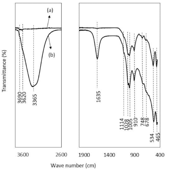 In the FTIR patterns of kaolinite (Figure 5), the bands range between 3620, 3690 and 3665 cm−1 in the case of the post-adsorption kaolinite sample, representing the -OH stretching vibration of the adsorbed water molecule, as the range between 3669 and 3696 cm−1 is designated for OH stretch []. Similarly, the bands located at 3696, 3669 and 3652 cm−1 are the typical signature of the inner-surface hydroxyls of kaolinite, and the peak at 3619 cm−1 is attributed to the stretching frequency of the internal hydroxyl groups []. The broad bands around 3365 and 1635 cm−1 are due to the adsorbed water in post-adsorption sample of kaolinite. The bands with a slight variation at 1028, 910, 1005 and 748 cm−1 represent the vibration of Si-O-Fe, Si-O, Al-OH, and Fe-OH, respectively, as the values of 1034, 1008, 911, and 795 cm−1 assigned to these groups []. Ioannou et al. [] also reported almost similar band values frequency for kaolinite–hematite composite. The peak value at 910 is attributed to the Al-OH bond stretching, as Maiti et al. [] reported 912 cm−1 for this group. Moreover, the bands at 534 and 465 cm−1 in kaolinite can be ascribed to the vibration of Si-O-Al/Fe, Si-O-Si and Al-O, as the range of 573 and 473cm−1 has been studied in previous studies []. The specific peak at 534 is attributed to the Al-O bending vibration []. The peaks at 748 and 465 are related to the presence of quartz as Mustapha et al. [] attributed 750 and 467 cm−1 to quartz. The band at 1114 cm−1 corresponds to the stretching vibrations of the Si-O-Si group, as described by Mbaye et al. [] in the range of 1100cm−1. Jalees et al. [] reported almost similar bands with slight variation in the frequency for a local kaolin called chikini mitti, obtained from the market. All the peaks in laterite and kaolinite were more intensified after adsorption.