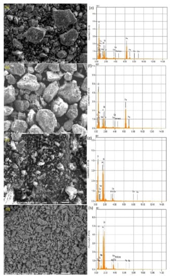 The morphology of selected laterite and kaolinite samples before and after sorption are shown in Figure 6a–d, along with the EDX spectra in Figure 6e–h. The SEM images revealed that the surfaces of the laterite and kaolinite are rough, along with particles having irregular shapes and sizes. The presence of a large number of such particles may attribute to the nanostructures and magnetic properties [], which contribute to the tendency for agglomeration and aggregation. The SEM images of laterite and kaolinite before and after sorption reveal clear changes in the morphology, which can be attributed to the adsorption of As in the pores and the roughness of the natural laterite and kaolinite surface. It can be seen that laterite and kaolinite have sheet-like morphology, which indicates the layered structure of the sorbents. The EDX spectrum of the laterite before and after sorption shows peaks of Fe and Al, which confirms the presence of Fe and Al oxides as a major constituent. Similarly, the EDX spectrum of kaolinite before and after sorption shows the peaks of Al and Si as major constituents, while Fe is in much lesser quantities. The EDX results of laterite and kaolinite are in line with the data of XRF. Hence, the role of Fe and Al oxides in the case of laterite, and Al oxides in the case of kaolinite, is clear. Based on the results, it is very much evident that the surface complexation reaction has occurred between aqueous As and sorbents (laterite and kaolinite). Thus, the sorbents used in this study have proven to be one of the most efficient sorbents for aqueous As remediation.