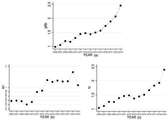 The development of with and in China from 2006–2019 is shown in Figure 1. As we can see in Figure 1a, the level increased significantly from 0.98 in 2006 to 2.45 in 2019. Comparing Figure 1b,c, it can be found that both technological progress and efficiency improvement have a significant increase from 2006–2019, but the increase in technological progress is closer to the improvement curve, which indicates that the green total factor improvement mainly comes from technological progress.