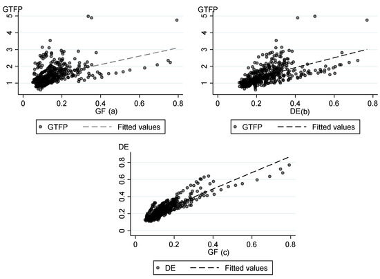 Green finance enables financial institutions to invest in green projects that can bring energy savings and environmental protection through the guidance of financial institutions. China’s economic transformation also promotes the concept of low carbon, energy saving, and environmental protection. For this reason, high-pollution enterprises face policy constraints as well as loan restrictions; Thus, they are more willing to comply with the concept of energy conservation and environmental protection through technological innovation and industrial structure innovation, which is conducive to raising the level of . The fitted graph of green finance and is shown in Figure 2a, which shows that there is a positive correlation between green finance and .