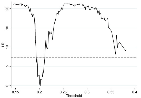 From row (6) of Table 7, it can be seen that the p-value of the single threshold of the decomposition term for on is 0.0367, which indicates that there is a threshold effect of on at the 5% significance level, while the p-value of the double threshold is 0.1033, which fails the test of a double threshold. Thus, there is a single threshold effect of on with a threshold value of 0.2020, and a single threshold effect is chosen. To verify the accuracy of the threshold estimates, Figure 3 gives the relationship between the threshold estimates and the likelihood ratio statistic, from which it can be seen that the threshold estimate of and is 0.2020 with a confidence interval of [0.1981, 0.2025], where the value of the likelihood ratio statistic is less than the critical value at the 5% level. Thus, the threshold effect estimate is considered to be true.