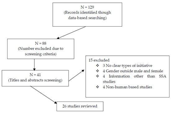 For inclusion and exclusion criteria, cross sectional studies, position papers, documents from relevant organisations, and governments from 2000 were included. The selected literature reviewed were mostly post-1994 International Conference on Population and Development (ICPD) publications where the world (179 governments) launched the historical sexual and reproductive health as a universal human rights. The post-ICPD marked the era of a massive campaign for women/girls’ reproductive health rights. However, where the complete article could not be downloaded, the titles and abstracts of such articles were reviewed for relevance and further screening []. The exclusion criteria were as follows: (1) studies or documents that are not human being based; (2) studies that are not related to reproductive and sexual health or rights are excluded; (3) studies without information on sub-Saharan Africa; and (4) non-relevant articles, reports, and so on. Data from the studies that met the requirement were extracted and assessed for quality. The entire retrieval procedures are as shown in Figure 1.