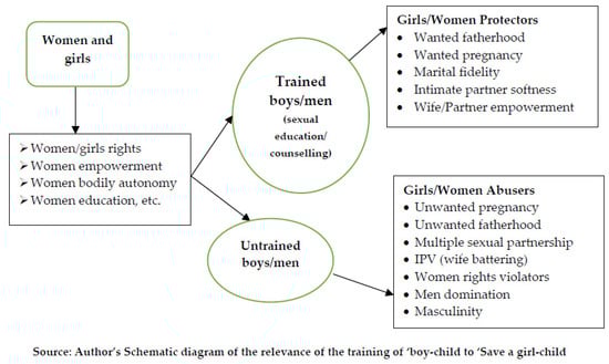 While the list of organisations pursuing women interests is inexhaustible, advocacies for men are scanty in the literature. However, despite these initiatives and organisation movements, the rates of unwanted pregnancy, abortion, and maternal deaths have not been conspicuously reduced in sub-Saharan African region [,,,]. While these innumerable measures were designed to save and protect girls and women, it is noted that these programmes and initiatives are explicitly concerned tangentially about the boys and men who are the suspected perpetrators. For every unwanted pregnancy, child-bride, abortion, etc., a boy/man is involved. Till date, there have not been popular behavioural suggestions for men concerning their own reproductive health rights; however, condom use has been entrenched [,,] and including family planning [,]. This paper is an exposition of the uniqueness of balanced gender initiatives considering the basic truth that, to save a girl-child, you must train a boy-child.