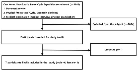 The participants of this study were adults aged from in their 20s to their 50s who did not have any musculoskeletal disorder, but had more than 7 years of experience with cycling. Furthermore, they were healthy individuals who had not participated in an exercise program or diet for the 3 months, and no specific disease was found in the medical examination. The participants were screened for their cycling abilities to complete the ultra-long-distance cycling event across Europe and Asia (One Korea New-Eurasia Peace Cycle Expedition, Figure 1). The participants consisted of 6 male and 1 female cyclist selected for the expedition (Table 1). The selected participants all received detailed explanation of the study purpose and procedures, and provided written consent. Ethical permission was granted from the Korea National Sport University’s Ethics Committee (Korea National Sport University Industry-Academic Cooperation Foundation-985), and all procedures were in accordance with the Declaration of Helsinki for research on human subjects.