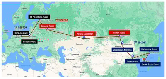 The course of One Korea New-Eurasia Peace Cycle Expedition. 1st section, from Berlin to Moscow (black square), 2nd section, from Moscow to Ulaanbaatar (red square) and 3rd section, From Ulaanbaatar to Seoul (blue square).