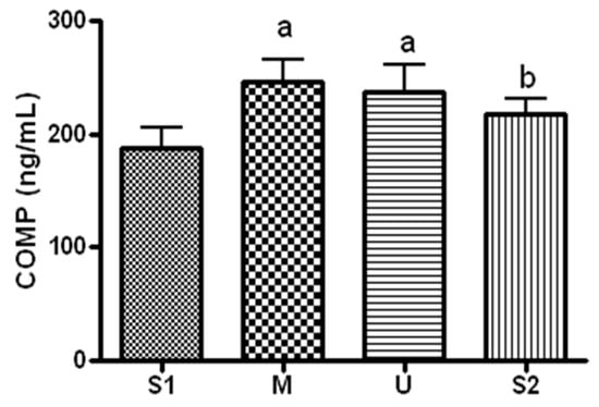 Serum COMP concentration in different locations. Values are mean ± S.D. Significance (p < 0.05) is denoted by a: relative to S1 and b: relative to M. S1: Before start in Seoul, M: Moscow U: Ulaanbaatar S2: Return to Seoul.