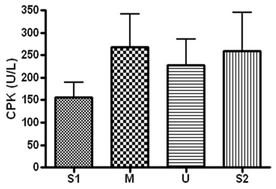 Serum CPK concentration in different locations. Values are mean ± S.D. S1: Before start in Seoul, M: Moscow U: Ulaanbaatar S2: Return to Seoul.
