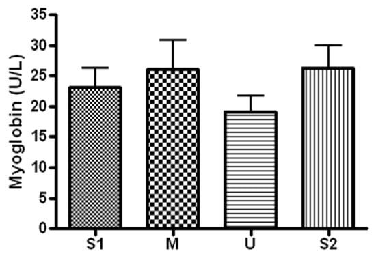 Serum myoglobin concentration in different locations. Values are mean ± S.D. S1: Before start in Seoul, M: Moscow U: Ulaanbaatar S2: Return to Seoul.
