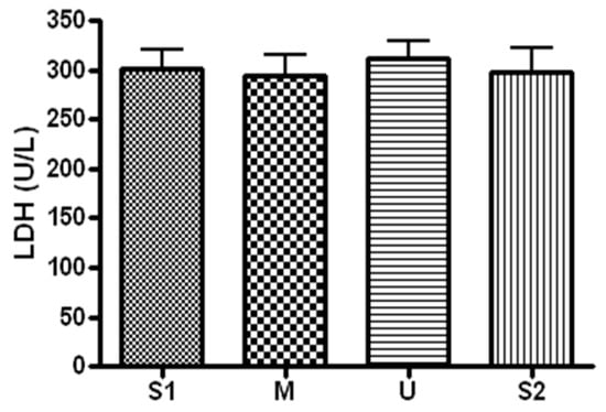 Serum LDH concentration in different locations. Values are mean ± S.D. S1: Before start in Seoul, M: Moscow U: Ulaanbaatar S2: Return to Seoul.