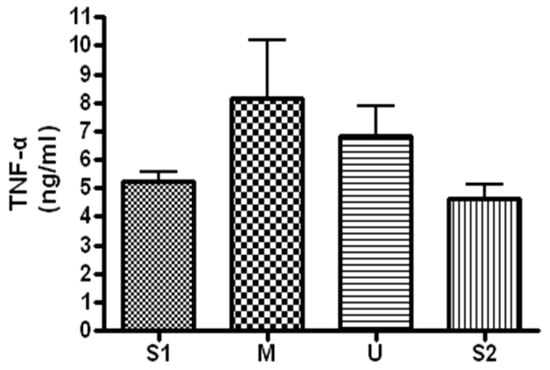 Serum TNF-α concentration in different locations. Values are mean ± S.D. S1: Before start in Seoul, M: Moscow U: Ulaanbaatar S2: Return to Seoul.