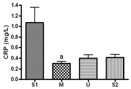 Serum CRP concentration in different locations. Values are mean ± S.D. Significance (p < 0.05) is denoted by a: relative to S1. S1: Before start in Seoul, M: Moscow U: Ulaanbaatar S2: Return to Seoul.