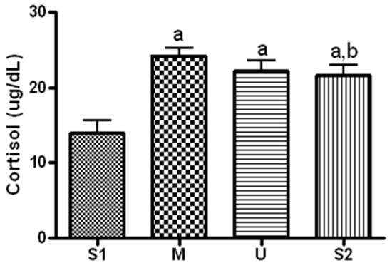 Serum Cortisol concentration in different locations. Values are mean ± S.D. Significance (p < 0.05) is denoted by a: Relative to S1 and b: Relative to M. S1: Before start in Seoul, M: Moscow U: Ulaanbaatar S2: Return to Seoul.