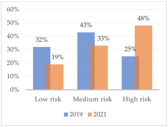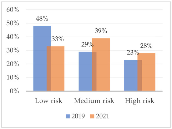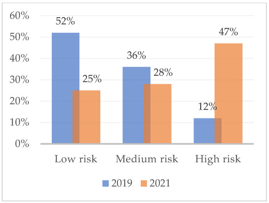 Figure 1 shows the percentage of subjects at high, medium, and low risk of developing burnout with respect to the dimension of emotional exhaustion, as measured in February 2019. Overall, almost half (48%) had a medium-low risk of burnout. The assessment that took place during the COVID-19 lockdown (2021), on the other hand, reveals variations in the percentages of burnout risk. High-risk workers are increasing (47%) and medium-risk (28%) and low-risk (25%) are decreasing. Figure 2 and Figure 3 show the risk percentages referred to as personal accomplishment and depersonalization.