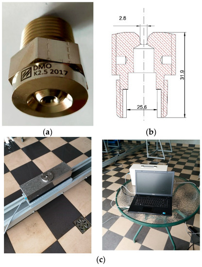 Low-pressure swirl water mist nozzle (a) photo, (b) technical drawing [mm], (c) AWKD Analyzer.