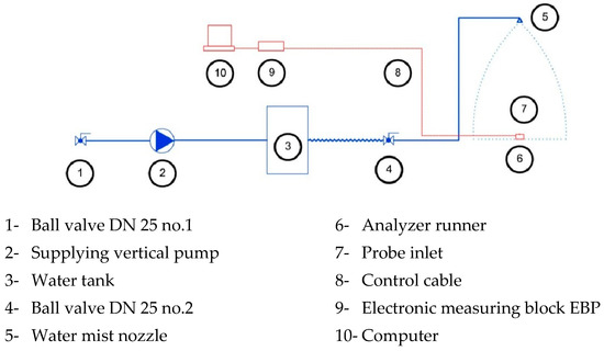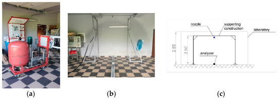 Water was supplied to the system using a vertical pump (2) with a capacity of 116 L/min and a maximum pressure of 1.58 MPa, as shown in Figure 2 and Figure 3a. A DN52 fire hose was used to supply the pump. During the measurements, the pump (2) supplied water through a 25-mm diameter rubber hose to a DN25 ball valve no.1 attached to the mobile structure shown in Figure 3b and pumped through the water tank (3) supply through ball valve no.2 water mist nozzle (5). As shown in Figure 3c, the sprayer was mounted 2.5 m above the floor. The measuring probe was 0.2 m above the floor level and measured the droplets from a nozzle mounted 2.3 m above the floor.