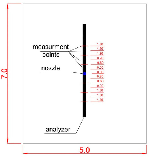 The test was carried out in a laboratory room with the following dimensions: 5 m (length) × 7 m (width) × 2.85 m (height). A scheme of the tested area is shown in Figure 2.