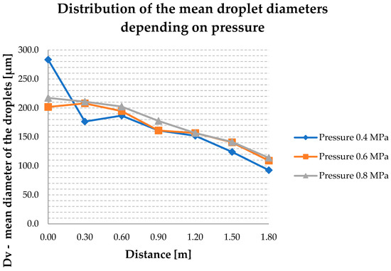 The radial distribution of Dv is very similar at all measuring points at any pressure as is shown in Figure 5. The differences mostly do not exceed 20 μm. It can be assumed that, with increasing pressure, the mean diameter Dv increases at each of the measuring points. As the graph shows, the highest average diameters are at a pressure of 0.8 MPa. However, in all tested distributions, Dv has a maximum of 283.4 μm at the point of 0.0 m at a pressure of 0.4 MPa. Then it rapidly decreases to a value of 176.6 µm at a distance of 0.3 m from the nozzle. As the distance from the nozzle increases, the decrease rate of the Dv is much smaller and is the lowest at a pressure of 0.4 MPa at 1.80 m, corresponding to 92.7 μm. At a distance of 1.2 m from the nozzle, the value of Dv at a pressure of 0.6 MPa and 0.8 MPa is the same, 156.7 μm. Moreover, at a distance of 0.9 m from the nozzle, the mean droplet diameter is 161.2 μm and is the same for 0.4 MPa and 0.6 MPa. For a pressure of 0.6 MPa, the distribution ranges from 201.7 μm to 109.1 μm, reaching its minimum at the point of 1.8 m. The radial distribution of the droplet size obtained at the pressure of 0.8 MPa is relatively uniform—the maximum size of 217.4 μm is recorded at 0.0 m, and the minimum distance is 1.8 m from the nozzle.