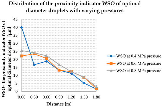 The WSO index shown in Equation (4) indicates to what extent the measured diameters are close to the value assumed to be optimal in terms of extinguishing efficiency. The value of WSO for the entire study area is approximately 82 μm. Performing an analysis of the distribution of values for this indicator, it can be seen that the diameters of the droplets closest to the optimum were obtained at the measurement point of 1.8 m—the average WSO = 2 μm, and the least close axially under the water mist nozzle at the point 0.0, where the average WSO = 29 μm. Analyzing Figure 6, it can be concluded that the WSO decreases with the distance from the nozzle, so the droplets generated by the water mist nozzle on the outside of the circle are close to optimal in terms of extinguishing efficiency.