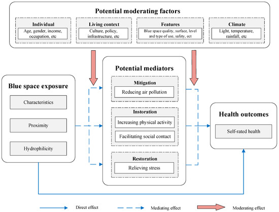 Previous studies indicated several potential biopsychosocial pathways linking blue spaces to health [12,13]. (1) Mitigation (e.g., reducing environmental harm of urban heat island effect, air pollution, and traffic noise): The cooling effect of blue spaces can absorb redundant heat [14]; remove pollutants, such as fine particulate matter, from the air [15]; and improve the soundscape, with road traffic, in urban spaces [16]. (2) Instoration (e.g., promotion of positive outcomes such as improved social contact or considerable physical activity): Nearby blue spaces encourage residents to engage in outdoor physical activity such as walking and jogging, which can stimulate health by producing natural feel-good hormones such as endorphins and encephalin. Blue spaces can also provide safe, attractive, and accessible places for social communication. Residents in a collective and cohesive atmosphere are likely to gain benefits such as social support and collective efficacy, which can generate positive health outcomes [17,18]. (3) Restoration (e.g., recovery from depleted attentional capacity or stress [19,20]): In environmental psychology, stress reduction theory (SRT) and attention restoration theory (ART) highlight the role of the natural environment in reducing mental stress and improving attention. SRT indicates that blue spaces in the natural environment can induce emotional experiences, thereby reducing individuals’ stress response [21]. Water was found to have restorative effects, such as being relaxing and refreshing. According to ART, four components of the blue space environment account for its restorative value, namely, being away, fascination, extent, and compatibility. ART suggests that blue spaces and other natural environments can attract and hold individuals’ attention, thereby facilitating the inhibitory mechanism in the brain and reducing attention fatigue symptoms [22].