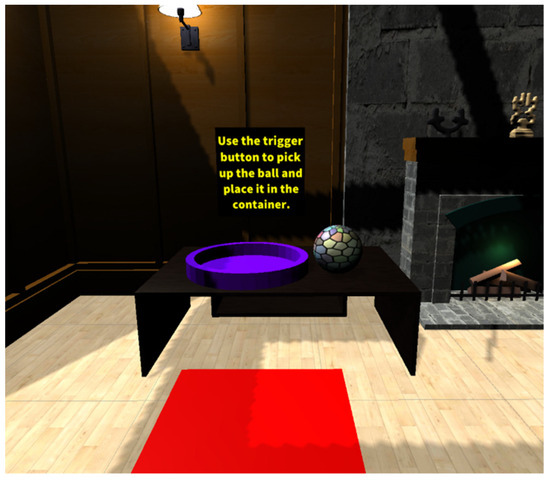 | Grabbing and placing an object | The user is presented with a ball and a container. The user can select the ball, pick it up and place it inside the container. | A ball and container were added to a table, both having bright colours distinct from the colour of the table. The ball is highlighted when the user points at it. The task is completed once the ball is placed within the container. |