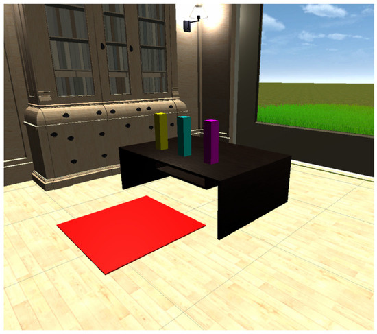 | Selecting an item | Three coloured blocks are presented which can be selected, picked up and placed back down on the table. The virtual hands have a ray extending out which enables the user to see where to point. | Three cubes of different colours were added to the top of a table. The colours of the cubes are bright, contrasting with the dark colour of the tabletop. The outline of the cubes is highlighted when the user points at them and haptic feedback is provided when the user hovers over the cube. |