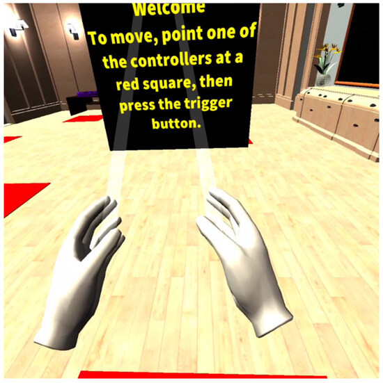 | Moving to another location | The user can navigate the VR space by pointing at teleport squares on the floor. Once the teleport square is highlighted, they press the trigger button and are then moved to that new location indicated by the teleport square. | Teleport squares have a distinct colour compared to the floor. The colour of the teleport square changes when the user points at it. A pointer also appears at the position to which the user is pointing. After the user highlights the teleport square and then presses the trigger button, the screen fades out, the user is re-located, and the screen fades in afterwards. |