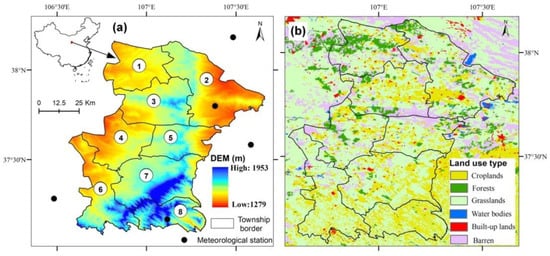 The terrain (a) and land use types (b) of the study area. Note: Yanchi county includes eight administrative towns, which are Gaoshawo (①), Huamachi (②), Wanglejing (③), Fengjigou (④), Qingshan (⑤), Huianpu(⑥), Dashuikeng (⑦), and Mahuangshan (⑧), respectively.