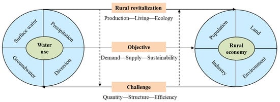 Thriving industry, pleasant living environments and prosperity are the three of the five goals of China’s rural revitalization strategy. The challenges presented by increasing water quantity demand, changing water use structure, and comparable lower water use efficiency need to be highlighted during rural revitalization (Figure 2). Increased water use can be explained from by the following aspects. First, more and more high-standard farmland and competitive agricultural industry will be established to support rural economic development. Clean and safe tap water supplies in rural areas make cooking, washing, and bathing more convenient than before. A beautiful countryside will attract more and more tourists from urban areas. Improved production and living conditions, and booming rural tourism significantly increase water demand. In addition, water is the foundation of rural landscape construction and is a booster for ecological environmental improvement. Rural construction and development exacerbate competition for water demand related to production, living and ecology, causing increases, and even shortages in water use [].