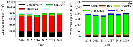 As the highest water use sector, agriculture accounted for 83.05–88.47% of the total water consumption. Industrial water consumption increased up to 5.04 times from 33.77 × 104 m3 in 2014 to 204.01 × 104 m3 in 2019. Significant interannual variations were found in the water consumption from urban, rural and ecological sectors (Figure 3b).