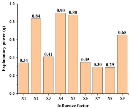 Influence factors of agricultural water use were analyzed using the model GeoDetector []. The relative importance of the influence factor (X) to the agricultural water use (Y) can be quantitatively described using the q-statistic [] in the following equation. The effects of two influence factors can be calculated by comparing the q values between the interaction and single [] using the sector of interaction detector: