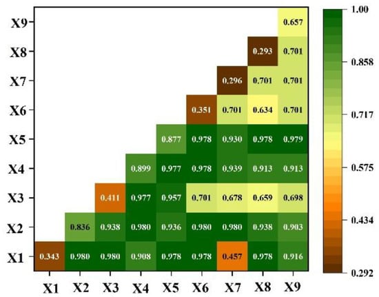 A better explanation was found between the two-factor interaction and single factor. Breeding stock (X4), rural per capita net income(X5) and effective irrigation area (X2) had a higher interaction explanation q value of more than 0.9 compared with other factors. Interaction q value between total population (X1) and precipitation (X7) was the lowest (Figure 5).