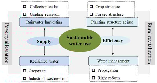 Water crisis and economic poverty are the two sustainable development issues closely related to each other []. Rural China, especially in the northwest region, faces the challenge of resolving the conflicts between water use and economic development. In the context of water scarcity, the coordinated configuration and efficient use of water resources are imperative during rural revitalization. In Yanchi county, water sustainable utilization can be achieved by increasing water supply from unconventional water resources and improving water use efficiency from governmental management (Figure 6).