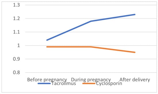 Tacrolimus-treated patients demonstrated, however, a statistically significant increase in serum creatinine concentration over time when prepregnancy values (1.04 ± 0.28 mg/dL) were compared to those during pregnancy (1.18 ± 0.39 mg/dL, p = 0.038) and postpartum (1.23 ± 0.44 mg/dL, p = 0.07), which was not the case in the CsA-treated subgroup (0.99 ± 0.11; 0.99 ± 0.32; 0.95± mg/dL, respectively, p = NS) (Figure 1).